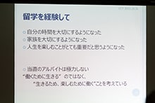 自分がどんな人間でコロナ禍をどう過ごし、何をしに留学し、帰国して何をしたいのか、そのために自分に投資してほしいという説得力のある話をどう8分に纏めるのか。その過程で余分なものがそぎ落とされ、精米歩合二割三分の大吟醸のように皆様の胸に沁みるプレゼンに仕上がったと思います。SUNRISEの皆様への感謝を胸に、これから留学を志す先生方への有益な情報提供ができるよう、さらに自分を磨いていきたいと思います。