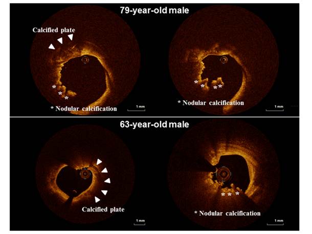 ACSおよび非ACS症例を含む新規責任病変889例(ACS 48%)を対象に、PCI施行前にOCTによる観察をおこなった。CNは結節性石灰化の噴出性集積と定義された。冠動脈造影の定量評価により、拡張期および収縮期の病変角度の変化(Δangle)が計測された。CNは全体の4.2%に認められ、右冠動脈入口部および中央部に頻繁に認められた。多変量解析において、血液透析、病変のΔAngle、OCTにおける最大石灰化角度がCNの存在と関連していた。ACS病変と非ACS病変を比較した場合、ACS病変においてはより最小内腔血管断面積(MSA)が小さく、血栓を伴っているものが多かった。石灰化角度180度以上の病変においては、ACS責任病変の30%にCNを認め、CNの存在は他の不安定プラークの形態とは独立してACSとの関連を認めた。