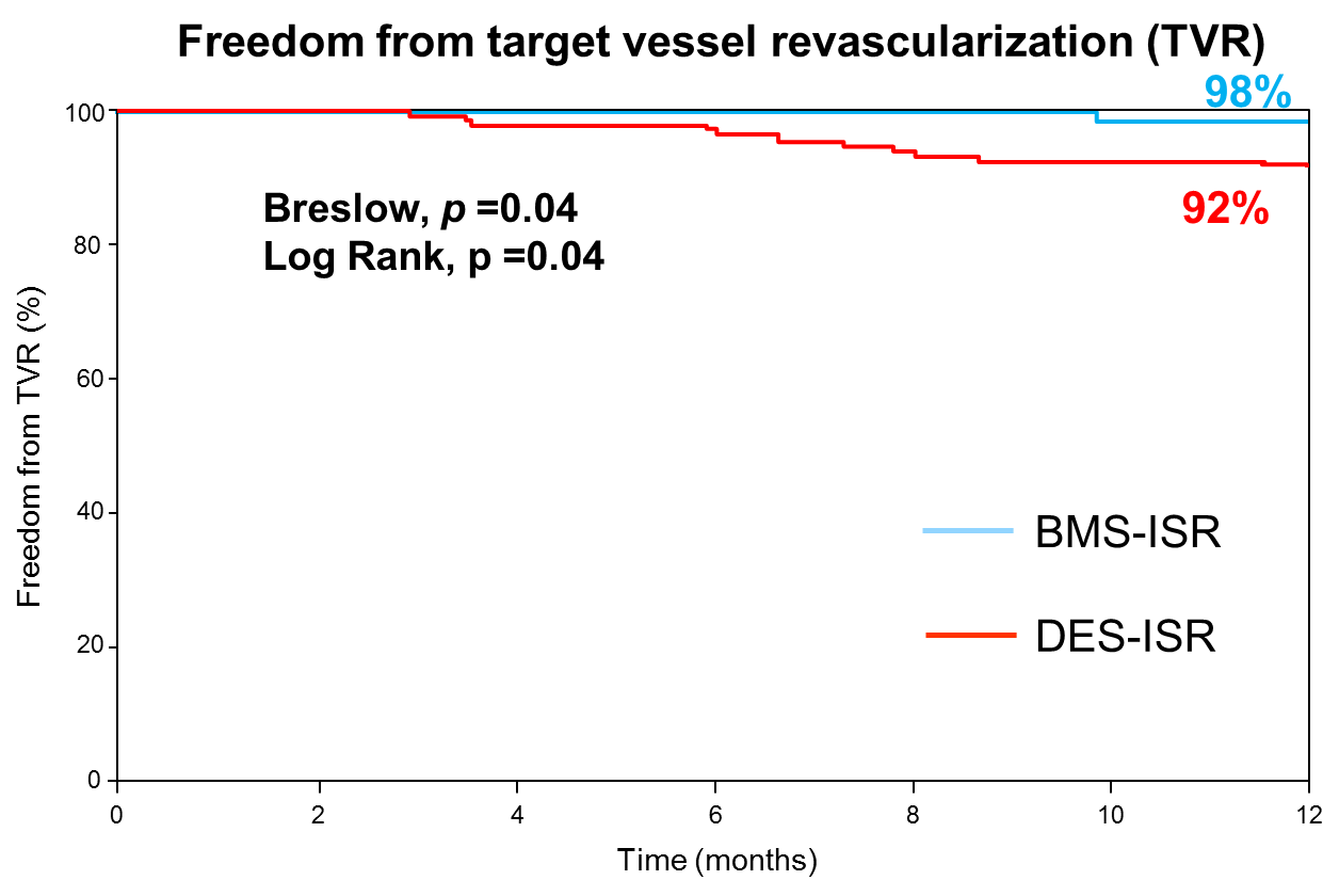 臨床フォローアップは100%で行われ、死亡、TVRはDES-ISR群で有意に高かった(フォローアップ1年でのTVR; BMS-ISR 1% vs. DES-ISR 8%, p=0.01)。またステント血栓症もDES-ISR群で2例認めたのに対し、BMS-ISR群では認めなかった。