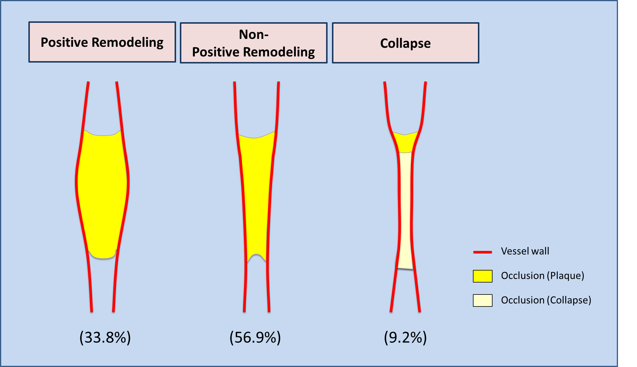 A Positive remodeling タイプは、CTO内のプラーク量は多いものの、対照血管にはプラークが少ない傾向があり、Non-Positive Remodelingタイプは、CTO内に石灰化が多く、対照血管にもプラークが多い結果でした。あくまで推測の範囲内ですが、IVUSの結果から、positive remodelingタイプはPlaque ruptureからの突然の閉塞に近い病態で、Non-positive remodelingタイプは長い狭心症歴があり、高度狭窄から、閉塞に至ったのではないかと解釈しています。一方Collapseタイプでは、対照血管にはほぼプラークがなく、その上、CTO内のプラークも少なく、そう考えるとより近い病態は、erosionからの閉塞なのではないかとの推測に至りました。また、プラークもしくは血栓により閉塞しているCTOは、病変の中でも近位の短い距離のみで、遠位のcollapseしている部分はCTでは閉塞しているように見えるものの、IVUSではプラークがほとんど無いため、血流が途絶えることで血管が潰れている状態と解釈しています。