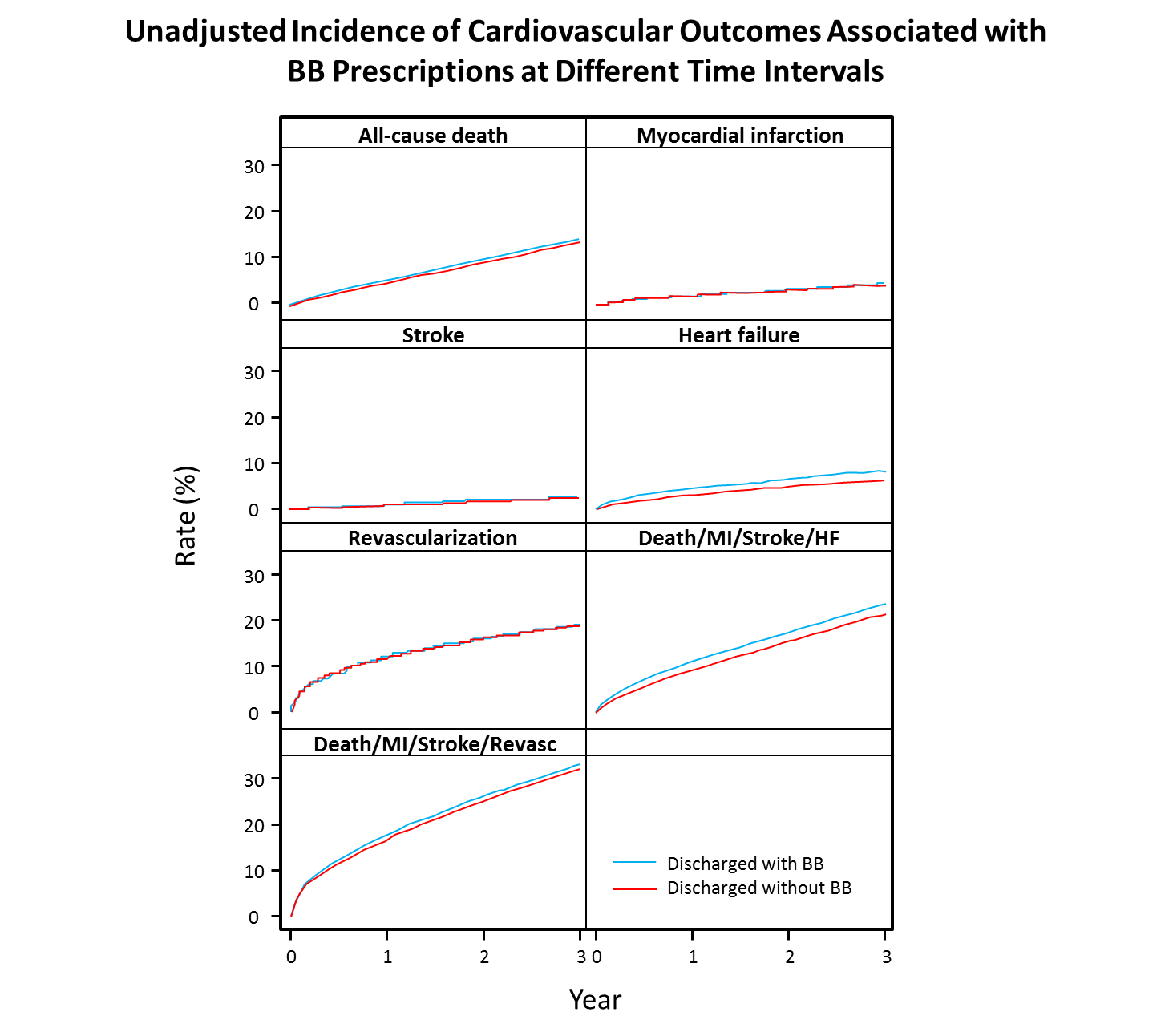 調整死亡率、心筋梗塞/脳卒中による再入院率、再血行再建率に関して、退院時にβ遮断薬が処方された患者とそうでない患者において有意差は認めなかった(adjusted HR: 1.00; 95% CI: 0.96 to 1.03; p=0.84)。心不全による再入院率は、β遮断薬が処方された患者で有意に高かった(adjusted HR: 1.18; 95% CI: 1.12 to 1.25; p<0.001)。