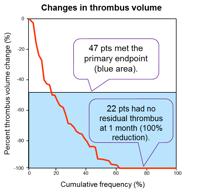 ② 抗血栓療法のみによって治療され1ヵ月後のOCTフォローアップがなされた55症例に関し、血栓量は有意に減少(-94.2%)していた。78.3%(47/60)の患者はプライマリエンドポイントを満たし、このうち22名は残存血栓を認めなかった。