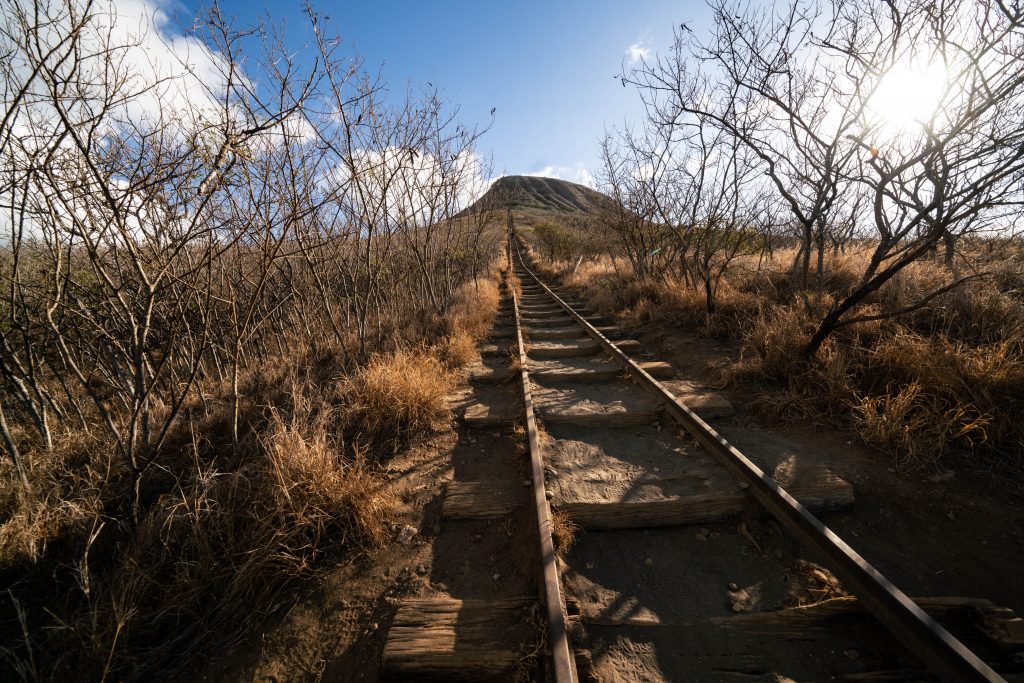ホノルルから車で東に30−40分程度です。無料駐車場があります。ハナウマ湾の隣に巨大な丸い山があり、ココクレーターと呼ばれています。この山の頂上には第2次世界大戦中に電波基地が置かれていたため、物資運搬のためのレールが残っています。このレールに沿ってひたすら真っすぐ登っていきます。