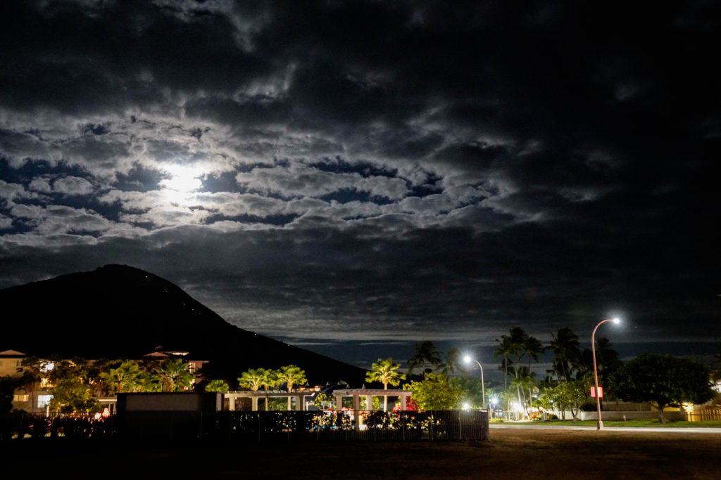図3: 左の山が夜のココクレーターです。中腹の白い点がヘッドライトで登る人たちです。