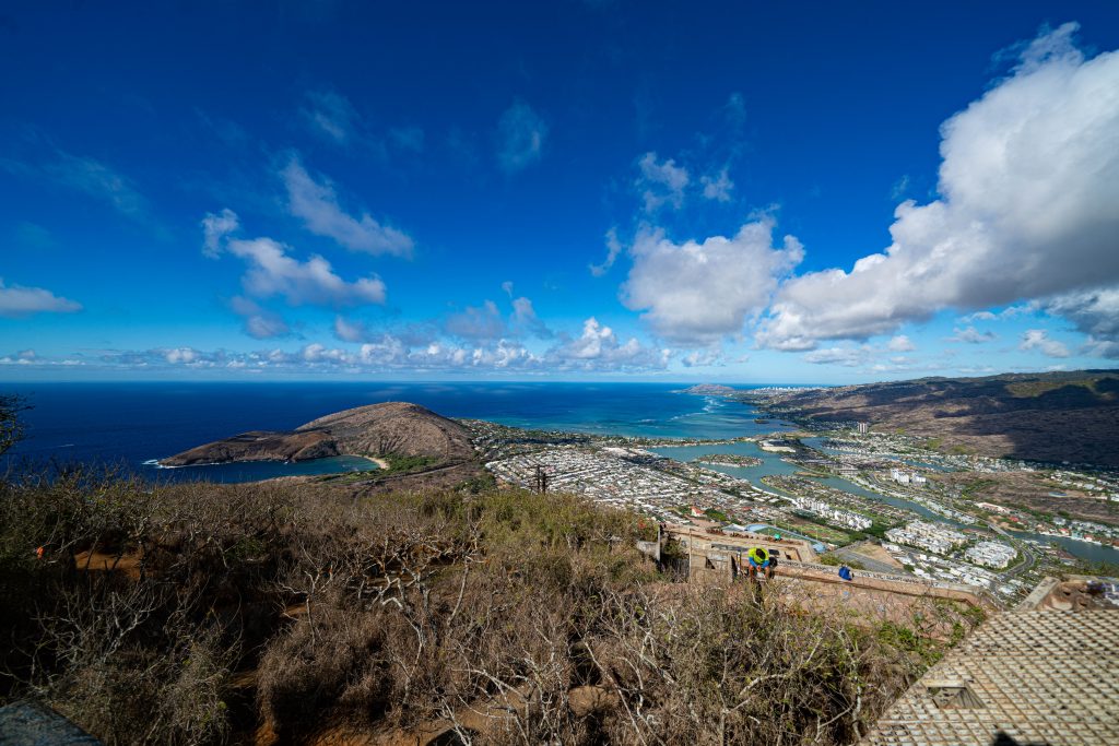 頂上から南を見下ろすと、ホノルルのベッドタウンであるハワイカイ地区が見えます。ハワイカイは入り江に沿って自家用船を舫う桟橋がついているような一戸建てやマリーナが並んでいるので、高いところからみるこのエリアは壮観です。