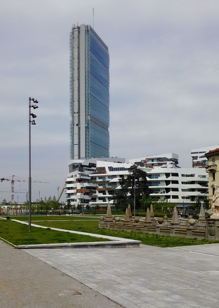 最後ですが、家の近くにCity Life Milanoという新都市計画として開発中の区画があります。広い敷地にオフィスタワー、ショッピングモールなどの複合施設、マンション、公園などが融合するような形で作られるというプロジェクトですが、(街中では一際目立つ)日本人が設計した高層ビルがすでに建っており(写真右)、さらに東京オリンピックの新国立競技場の案で話題になったザハ・ハディド氏設計の建物も建設中です。ただ2015年に完成予定だったはずですが、工事は当然のように遅れ、この半年もあまり進んでいる感じはしません。すべての完成を楽しみにしているのですが、そこはイタリアなので、いつになることでしょうか。