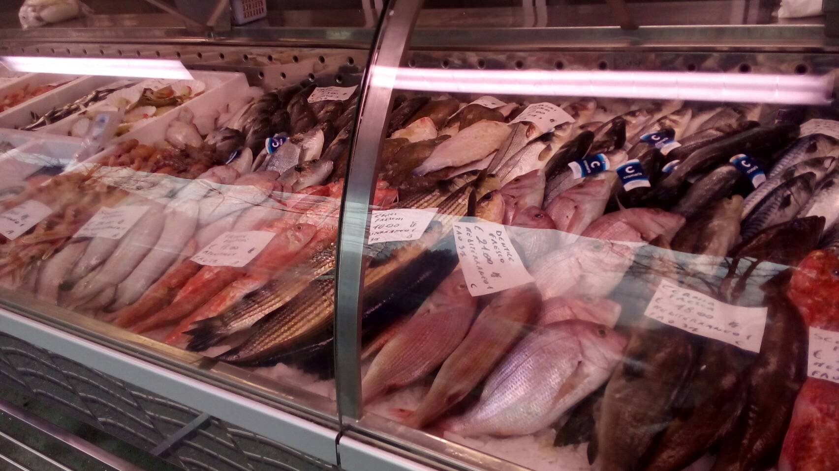 写真5,6, 7 近所のスーパー、発泡ワイン(3ユーロ)、行きつけの魚屋。スーパーでだいたいなんでも揃う。はじめは辞書持参で通っていた。