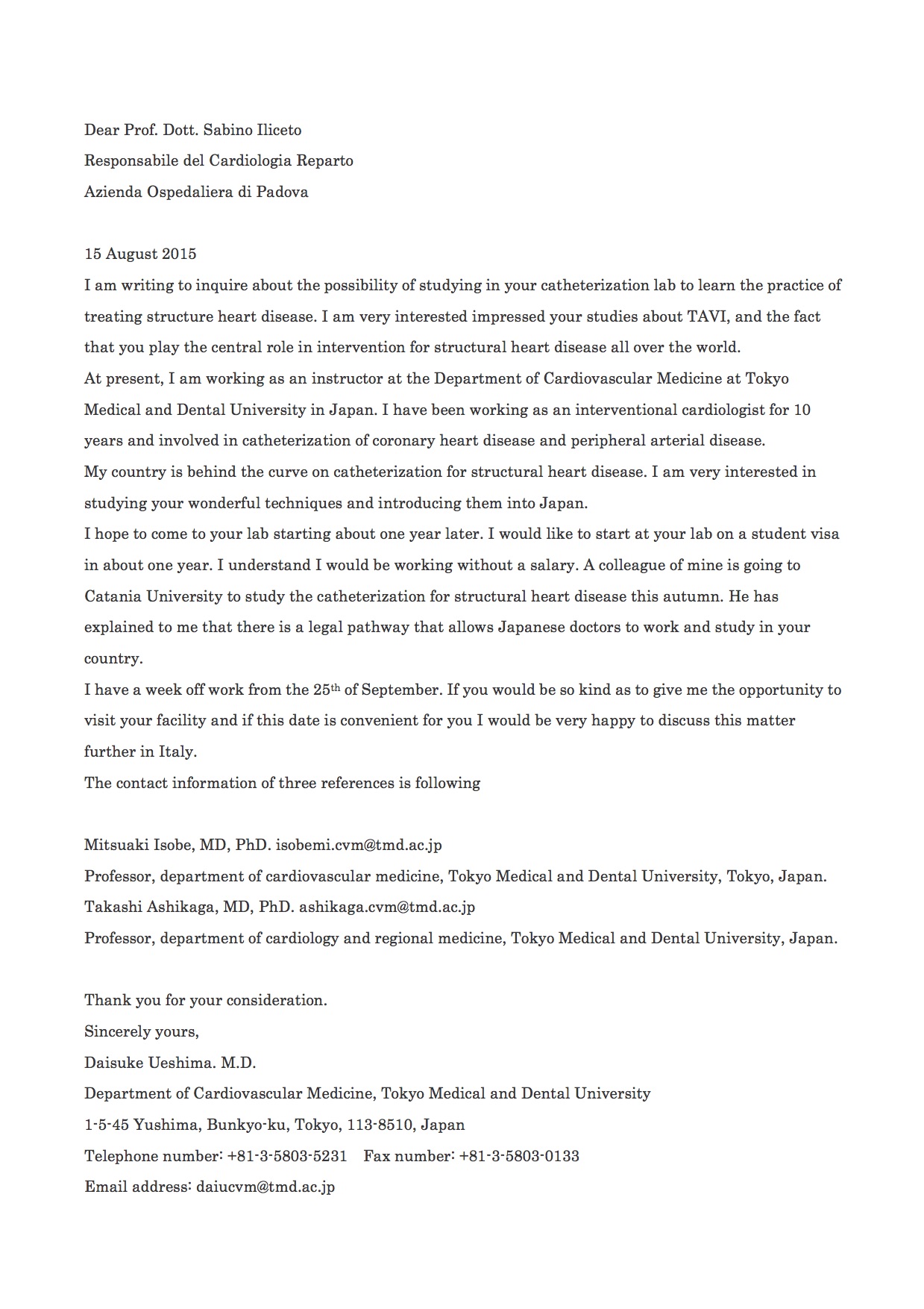 私の所属する医局では年に一度人事希望アンケートを提出するよう求められ、それまでは「どこでも行きます」というスタンスを取っていたのだが、その年初めて「大学勤務希望」と書いた。当時の勤務先では、理解ある上司の下PCI, EVT, PM, ICD, CRTD, ablation, PVI, coiling, stent graft等々携わらせていただく手技が多かっただけに葛藤があったし、今でも良い選択だったのかわからない。ただ、留学をマイルストーンとしている以上異動は避けられなかった。