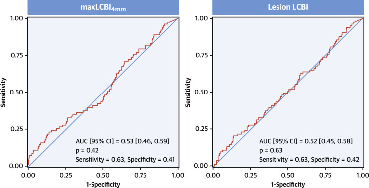 Figure 4. ROC解析においても、ともにAUC 0.5程度であり、culprit lesionにおけるLCBIの値はその後のイベントへの影響は少ないと考えられる。