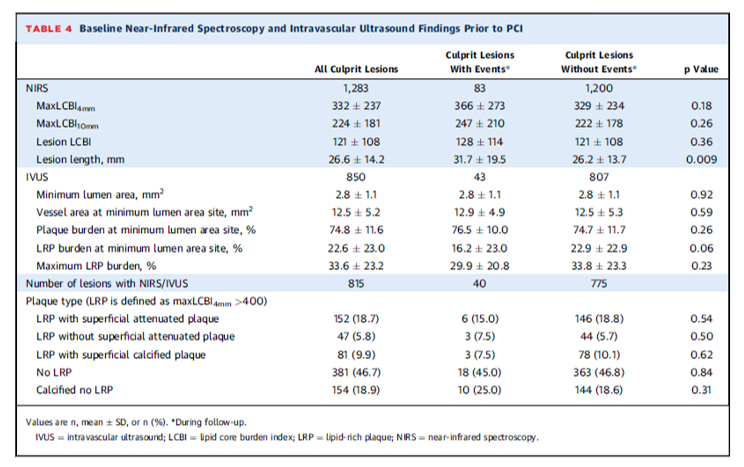 この前向き多施設登録では、CAGを施行されPCIを行う可能性がある患者を対象にNIRS-IVUSを行った。maxLCBI 4 mmは、任意の4 mm長のセグメント内の最大LCBIと定義した。MACEとして、心臓死、心筋梗塞、ステント血栓症、または進行性狭心症または不安定狭心症のための計画外の再灌流または再入院が含まれた。イベントは、病変関連culprit-related (stenting site)、病変に非関連nonculprit-related (未治療)、または不確定indeterminateとして分類された。