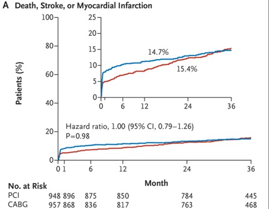 EXCEL試験は、XIENCE Stentを用い、SYNTAX score 32点以下のLMT病変をCABGとPCI治療にランダマイズされた研究で、2016年にNEJMに報告されています。1,905例が割付けされ、一時エンドポイントは死亡・心筋梗塞・脳卒中とし、PCIのCABGに対する非劣勢が示されました。SYNTAX scoreが低い症例のみとなっていますが、全世界のCoronary interventionistを勇気づけた研究であると思います。