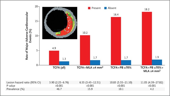 循環器内科医であれば一度は目にしたであろうFigureです。この論文の中でMACE発症の予測因子はPlaque burden 70%以上、Thin cap fiboroatheroma, Minimum Lumen Area 4.0 mm2以下とされております。カテーテル治療におけるIVUSの役割に対して非常に大きなインパクトを与えました。