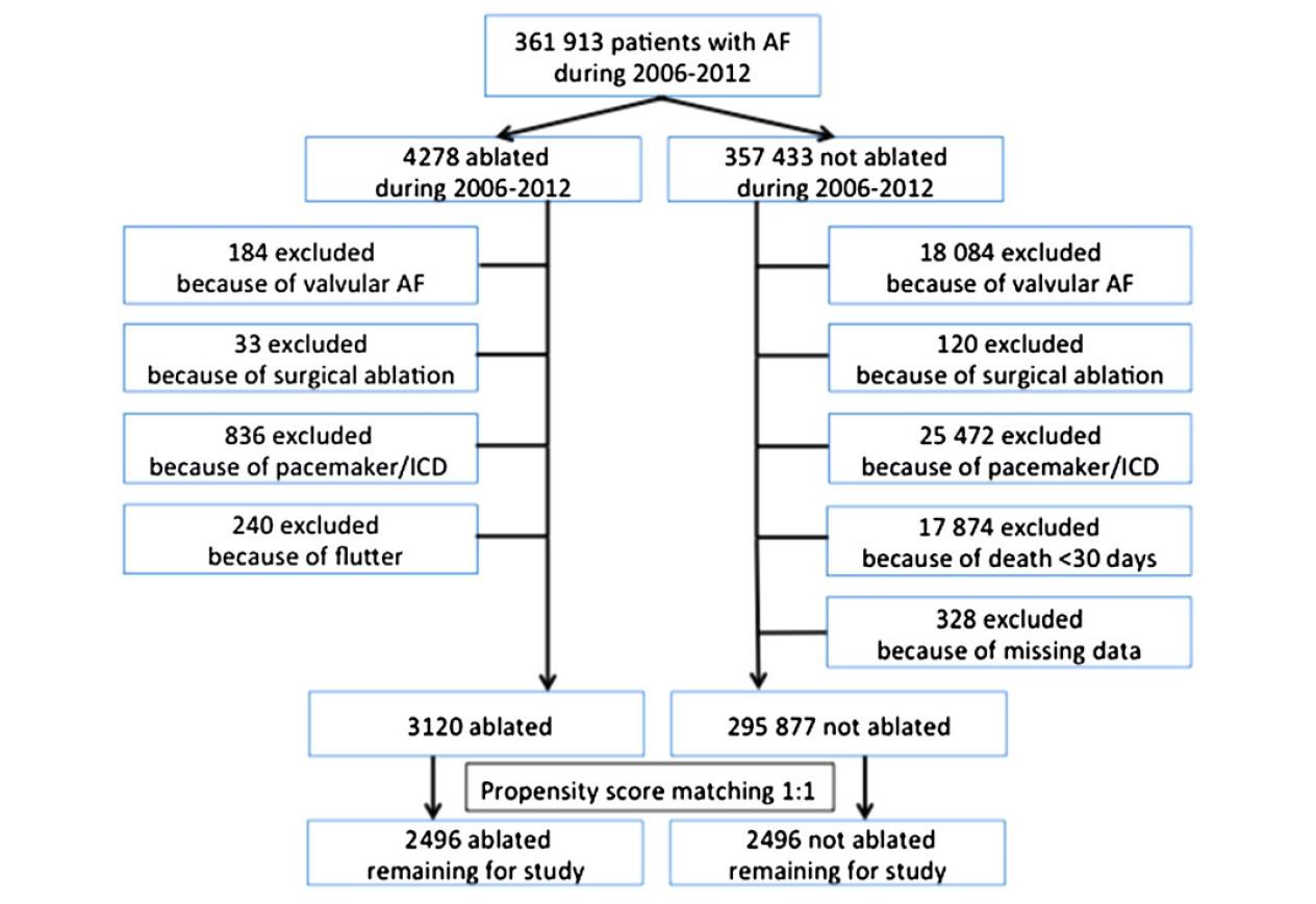 方法:2006年から2012年の7年間にスウェーデンでAFと診断された361,913人を調査した。そのうち4,278人がアブレーションを受けていた。アブレーション治療を受けた患者は非アブレーション患者に比べてより若年(58.7 vs. 74.7歳, P < 0.001)であり、より健康的(平均CHA2HD2-VAScスコア 1.5 ± 1.4 vs. 3.6 ± 1.9, P < 0.001)であった。傾向スコアマッチングを行い(51項目)、両群のサイズおよび背景を可能な限り一致させた(N = 2,836)。