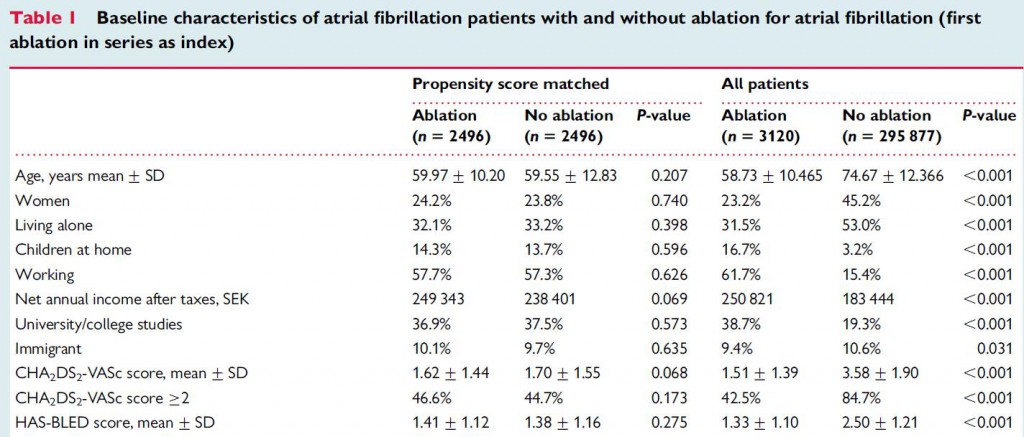 私見:アブレーションの予後改善効果を論じる際によく引用される代表的な論文だと思います。前向き介入試験ではありませんが、非常に大きな症例数で検討されています。加えて傾向スコアマッチングを用いて可能な限り条件を揃えた2群間での比較であり、学ぶべき知見に富む重要な論文だと思います。マッチング後の平均年齢は約60歳ですので、我々が普段接する患者さんの年齢に近いデータです(愛媛大学のAFアブレーション患者の平均年齢が62歳くらいです)。しかしながら、アブレーション群と非アブレーション群のマッチング前の群間差は非常に大きく、特に年齢やCHA2HD2-VAScスコアの差は歴然です(表参照)。臨床医は治療方針を決める際に、数値化できない直感を働かせます。たとえ国が違っても、「なんとなくヤバそうな人」には侵襲的な治療は避けたいというのが人情でしょうから、どうしても治療方針を決める際のバイアスは避けられません。傾向スコアマッチングを行ったとしてもこのバイアスを完全に除外することは難しいと思います。ゆえに、結論は「may be associated」としているのだと思います。しかし、それを差し置いても素晴しいデータだと思います。