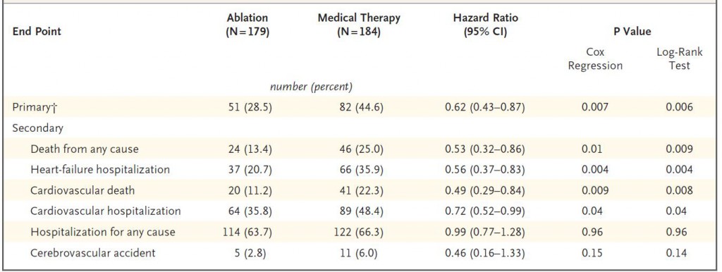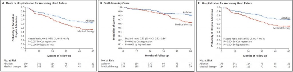 結果:中央観察期間37.8ヶ月の間に、主要複合エンドポイントの発生は薬物治療群に比較してアブレーション群で有意に少なかった(51例 [28.5%] vs. 82例 [44.6%]; HR 0.62; 95%CI 0.43-0.87, P = 0.007)。アブレーション群では全死亡(24例 [13.4%] vs. 46例 [25.0%]; HR 0.53; 95%CI 0.32-0.86, P = 0.01)、心不全増悪に伴う入院(37例 [20.7%] vs. 66例 [35.9%]; HR 0.56; 95%CI 0.37-0.83, P = 0.004)、もしくは心血管死(20 例 [11.2%] vs. 41例 [22.3%]; HR 0.49; 95%CI 0.29-0.84, P = 0.009)が有意に少なかった。