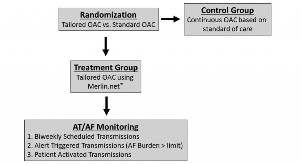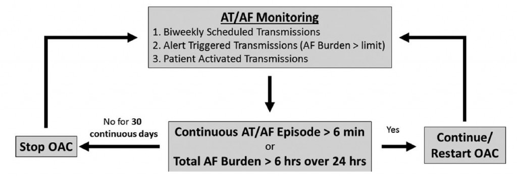 心房細動(AF)の持続期間や頻度に関係なく、血栓塞栓症の危険因子を有するAF患者には絶え間ない抗凝固療法が推奨されている。ペースメーカ(PM)や植込み型除細動器(ICD)を用いた継続的な調律モニタリングと直接経口抗凝固薬(DOAC)を使用することで、AFが生じた時のみ抗凝固を行うことが可能かもしれず、血栓塞栓症リスクを増加させることなく出血リスクを減らすことができるかもしれない。