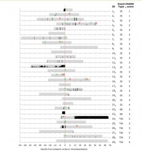 図5. (文献3より引用): IMPAC試験における血栓塞栓イベントと心内電位の経時記録。中央のオレンジの点線が血栓塞栓症を発症した時期を示す。灰色は心内電位モニタリング期間、その中の黒がAFイベントの記録。
