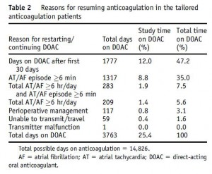 AF頻度が少なく、低~中程度の血栓塞栓症リスクのAF患者において、PM/ICDモニタリングを指標にしたDOAC投与は実行可能であり、それによって抗凝固療法を行う期間が75%減少した。本研究は有害事象を評価できるほどの検出力を持ち合わせていないが、有害事象はほとんど生じなかった。PM/ICDモニタリングを指標にしたDOAC投与は永続的な抗凝固療法に替わる現実的な治療法かもしれない。さらなる検討が必要である。