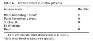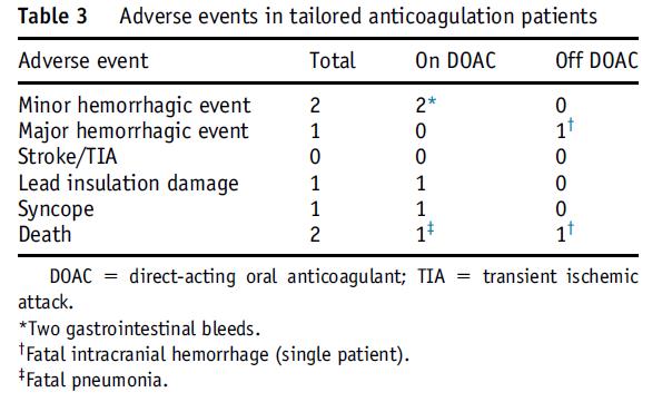 試験期間中に間欠的抗凝固療法群48人において、6件の有害事象が観察された(表3)。3件の出血イベントが確認され、うち2件は小さな消化管出血(2件ともDOAC使用中)、1件は致命的な脳内出血(DOAC中断中)であった。失神を含む8件の神経学的イベントの可能性が考えられる症状が確認されたが、明らかな塞栓性脳梗塞/TIAは全く確認されなかった。試験期間中に2名が死亡、1例は前述の脳内出血(DOAC中断中)、1例は肺炎(DOAC使用中)が原因であった。