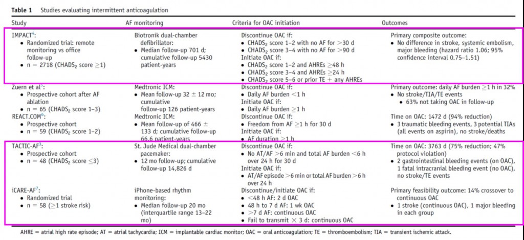 そこには「時期尚早」とはっきりと書かれています。最大の理由は遠隔モニタリングを使用した抗凝固療法を検討した試験が今のところ非常に少ないためです。下表には間欠的抗凝固療法を検討した研究が挙げられています。5つの試験のうち、Zuernらの試験とREACT.COM試験はAFアブレーション後の患者を対象としていますので、純粋な意味で遠隔モニタリングを指標にした間欠的抗凝固療法の試みはわずか3つです(ピンクの四角内)。今回のTACTIC-AF試験とiCARE-AF試験は対象患者数がそれぞれ48人と58人であり、非常に少数例での検討になっています。
