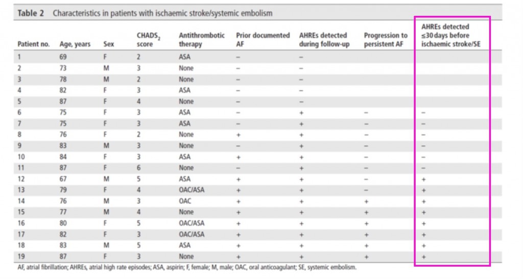 実は私もDevice-detected AFに興味を持ち、日本人患者を対象に調べたことがあります [6] 。私が調べた範囲(PM患者343人)でもDevice-detected AFは塞栓症イベントに関連したのですが、下表の通り血栓塞栓イベントを認めた19人中、Device-detected AFを認めた患者は14人、直前30日以内にAFが記録された患者は8人だけでした(下表四角内)。