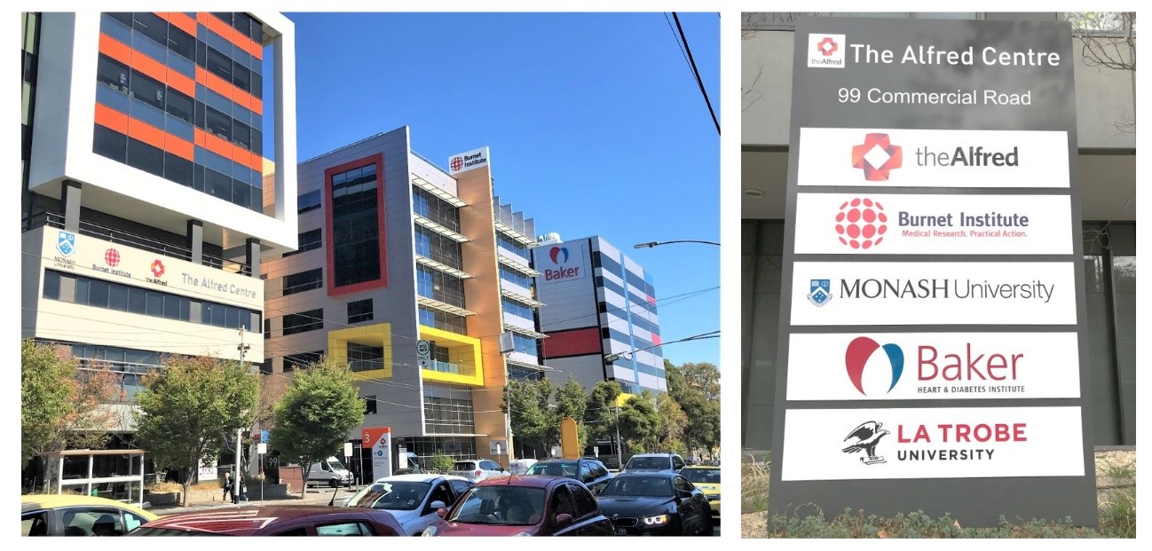 右: Alfred Centreには様々な機関の研究施設が入っています。Centreの綴りに注目!