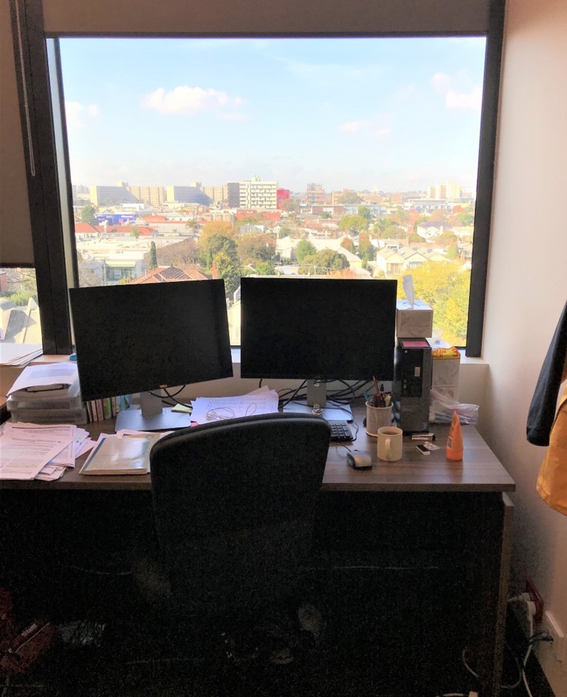 右: 休憩室からの眺め。遠くにメルボルンの中心地が見えます。