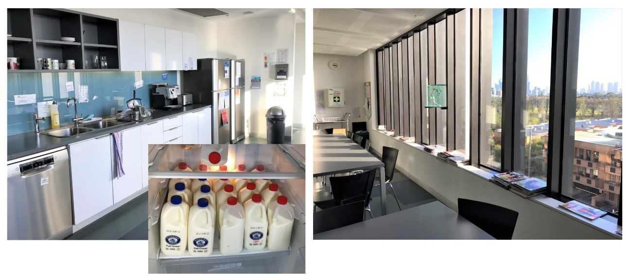左: 休憩室。食洗機やコーヒーメーカー完備。冷蔵庫にはおいしい牛乳がたくさん(飲み放題)。さすがオーストラリア!