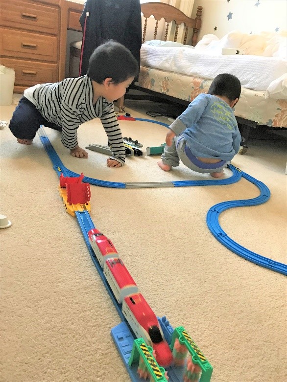 大好きなプ○レールで遊ぶ子供達。おもちゃの他に日本語の図鑑なども船便で送りました。輸送費は高くつきましたが送ってよかったです。