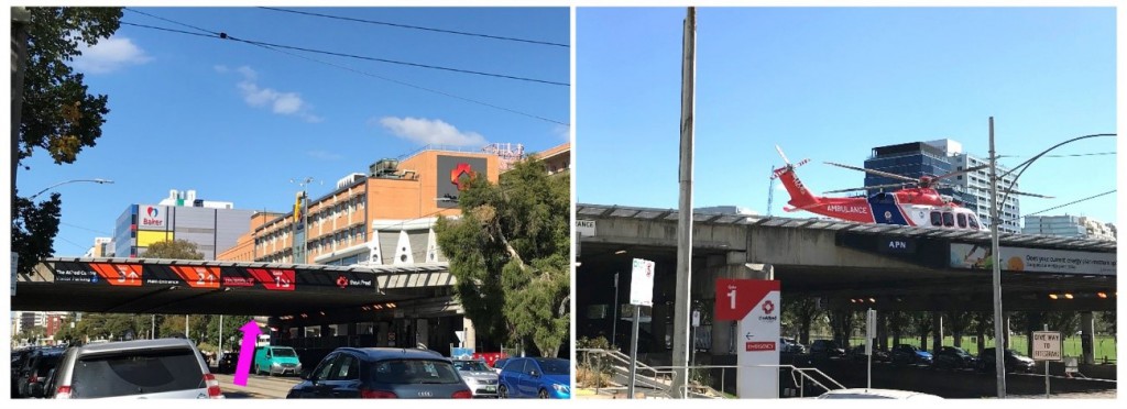 左: 遠景。手前の建物がAlfred Hospital。矢印はヘリポート。