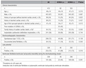 多施設共同研究。Brugada症候群患者415名(男性403名、平均年齢46±14歳)。全例でSCN5A遺伝子の解析が行われた。