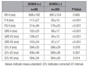 表5: 心電図比較(文献4より)。SCN5A異常を認める患者群の方がより伝導遅延が強いことを示している。