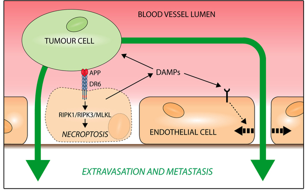 図5. がん細胞はdeath receptor 6 (DR6)を介して内皮細胞の細胞死(necroptosis)を起こし、その結果生じる隙間から血管外へ遊出する(Strilic B, et al. Nature. 2016)