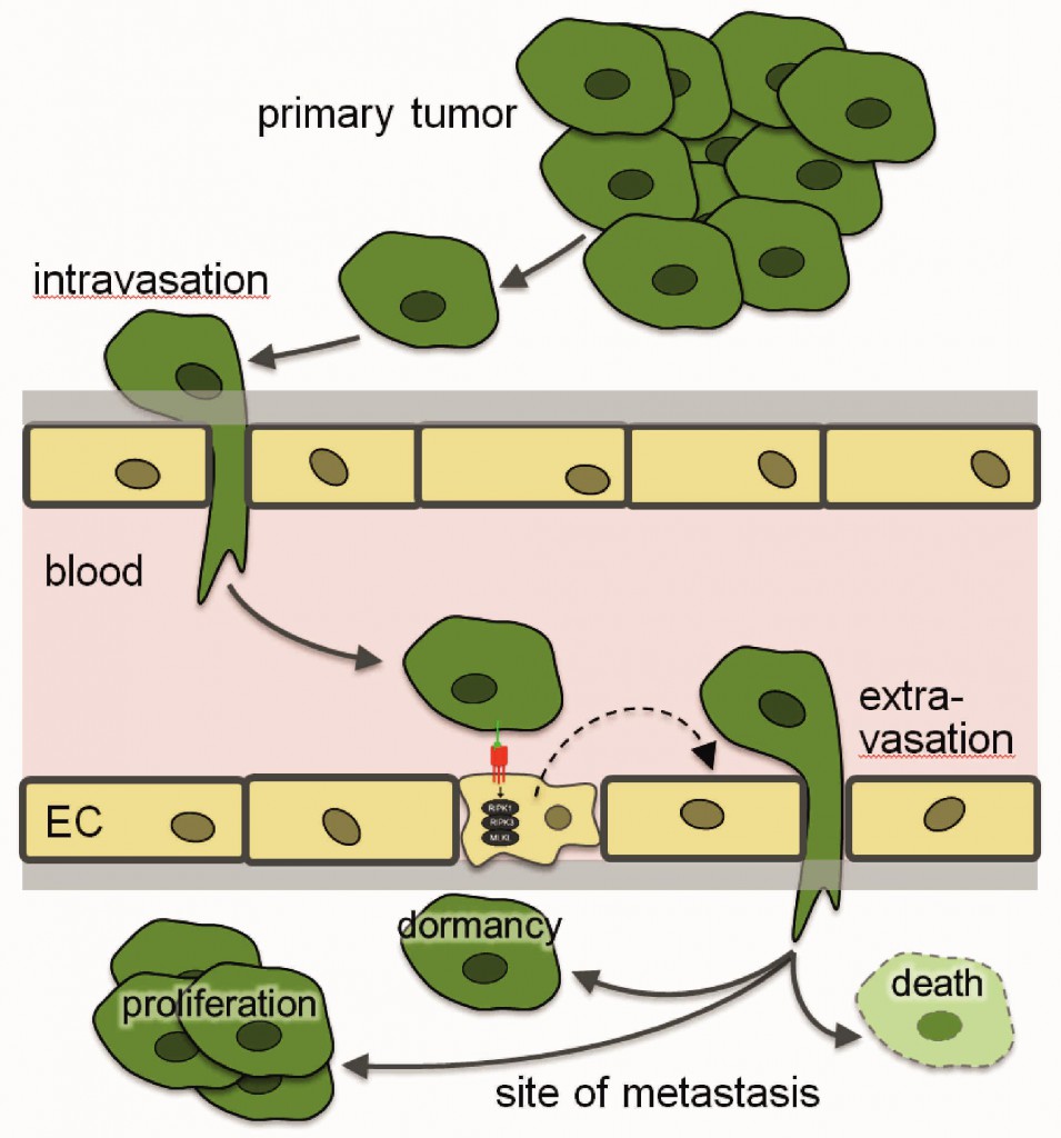 図4. 血管内皮はがん転移の障壁として機能する(EC;血管内皮細胞)