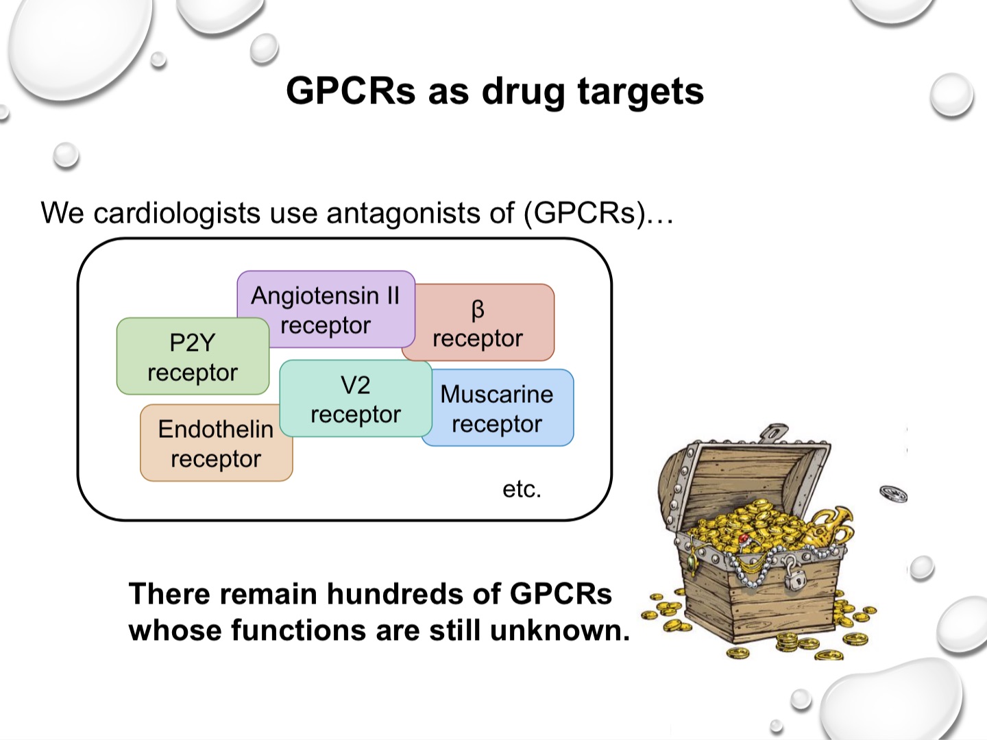 私たち循環器科医が日常的に処方している薬剤のターゲットであるこれらの受容体は、共通した構造上の特徴を持つ「Gタンパク質共役受容体(G protein-coupled receptor: GPCR)」に分類されます。GPCRに対する理解は医薬品の開発に大きく貢献したとして、京都大学の山中伸弥教授がノーベル生理学・医学賞を受賞したのと同じ2012年、ノーベル化学賞がこのGPCRの中心的研究を行ったDuke大学Robert J. Lefkowitz教授とStanford大学Brian K. Kobilka教授に贈られています。現在臨床で使用されている薬剤の約30%はGPCRを作用標的としていますが、その一方で、未だ150ものGPCRについてはその機能や結合する物質がわかっていません(図1)。