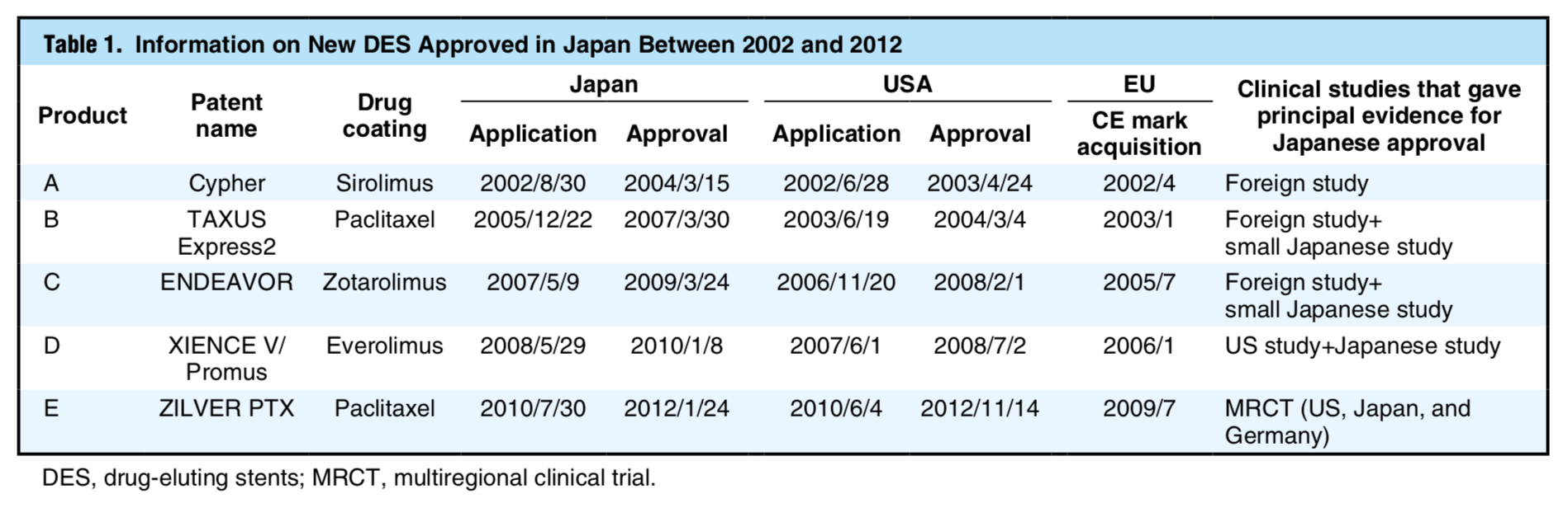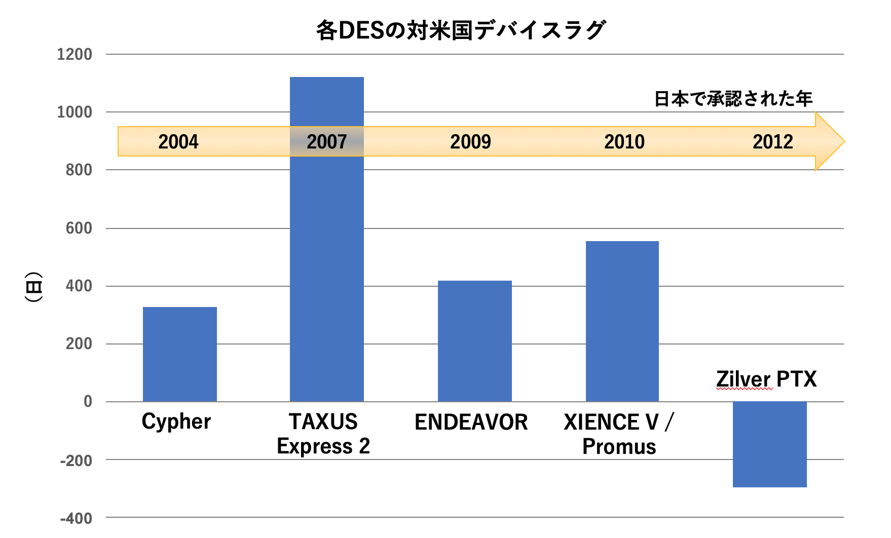 具体的な一例として、DESの承認プロセスに関する論文を紹介します(文献2)。この論文では、年代順に、Cypher、TAXUS Express2、ENDEAVOR、XIENCE V / Promus、Zilver PTXという5つのDESの国内承認プロセスについて、対米国ラグの観点から考察されています(表2, 図1)。なお、全てのDESにおいて、CEマーク取得はFDA承認よりも数年先行しています。