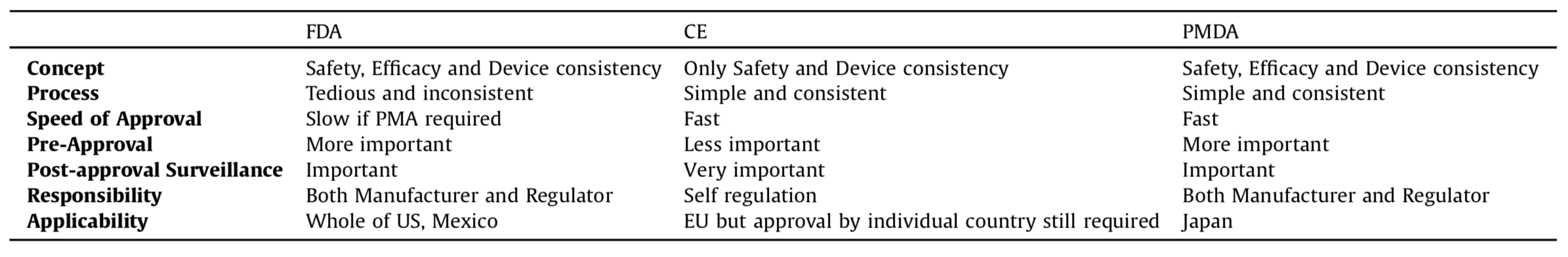 表1. 医療機器承認におけるFDA、CEマーク、PMDAの違い (文献1より)