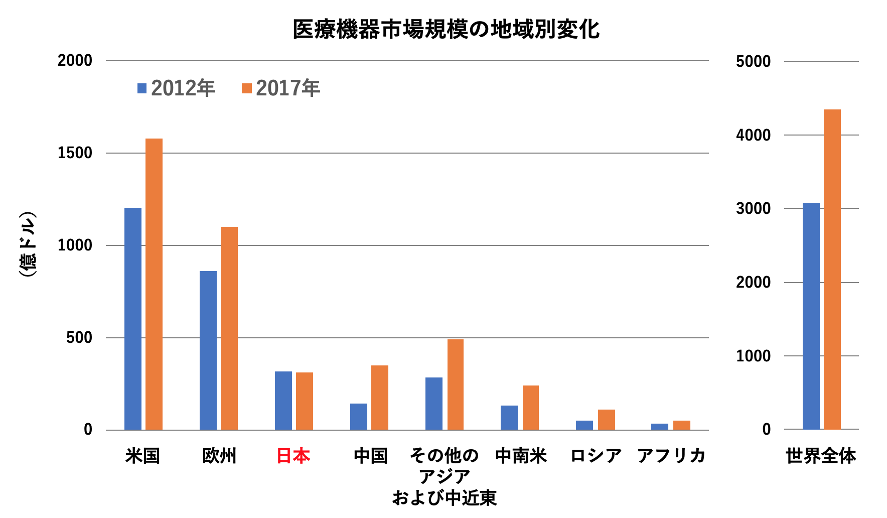 図3. 医療機器市場規模の地域別変化 (文献4をもとに筆者が作成)