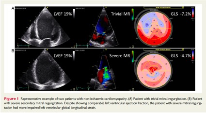 2016年で少し古めですが、secondary MR患者においてEFをmatchingさせたコホートでのGLSの比較をしています。GLSの悪化している群ではEF同等でもMRが多く、よりLVのforward flowを反映しているのではないかと主張しています。