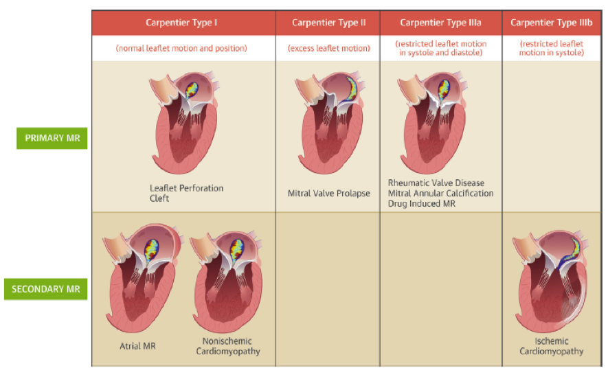 下記の図は大変有名なCarpontierによる僧帽弁形態の分類とMRの成因による分類の図ですが、下段がsecondary MRに分類されます。