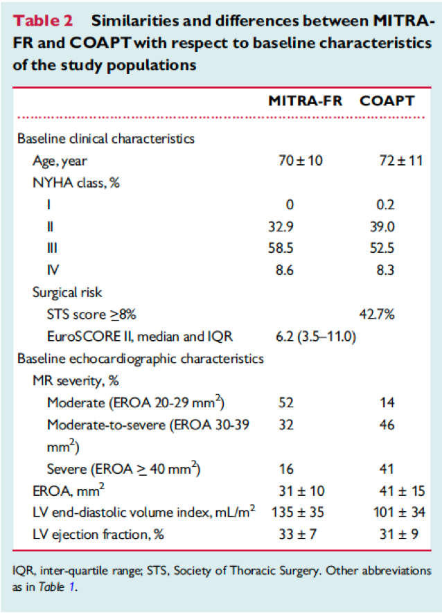 両研究の患者背景を比較したところ、MITRA-FRではCOAPTよりも左室のサイズが大きく(indexed LVEDV 135±35 ml/m2 vs 101±34 ml/m2)、MR逆流弁口面積(EROA)は小さい(0.31±10 cm2 vs 0.41±15 cm2)という差が認められました。