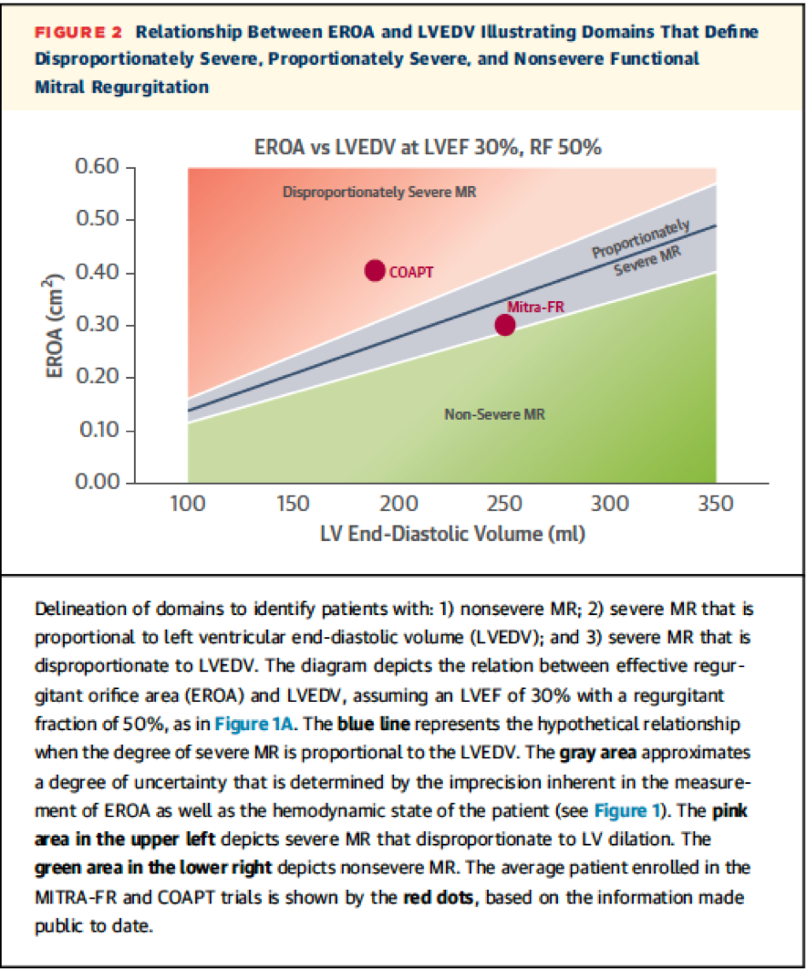 このreviewでは、LVEDVをx軸、EROAをy軸とし、青の線を仮想の比例ラインとしてその下(green area)はnon-severe MR, 比例ライン付近(gray area)をproportional severe MR, 比例ラインに比してEROAが高い群をdisproportional severe MRとしています。「Proportional」という言葉は釣り合いの取れた、とかバランスのいい、といった単語なので、それぞれ日本語で言えば均衡性severe MR, 非均衡性severe MRといったところでしょうか。左室障害の度合いと比例せず、MRの度合いが強い症例がMITRA-FRと比してCOAPTに多かったことが一つの要因ではないかとされています。ただこのlogicの問題点はあくまで比例ラインは仮想であり、どの症例が本当にMitraClipによるbenefitを得られるのかはまだ謎のままです。