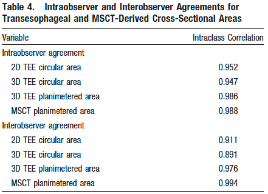 一方で心エコーの弱点としては、再現性の低さや検者間誤差、石灰化/人工物などに伴うアーチファクト、被検査者側要素(体位、体型、エコーウインドウの差異など)による描出困難例の存在などが挙げられる。下表は大動脈狭窄患者における大動脈基部のTEEとCTにおける評価の比較である。3D TEEではかなり改善されているとはいえ、誤差の面では他のModalityに劣ると言わざるを得ない。