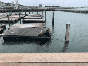 フィッシャーマンズワーフ: 土産物店、蟹の屋台、サワードウ ブレッドの器に入ったクラムチャウダーの屋台があちこちにある観光地です。アシカの群れが見られるスポットや、歴史ある船の見学ツアーもあります(写真2)。