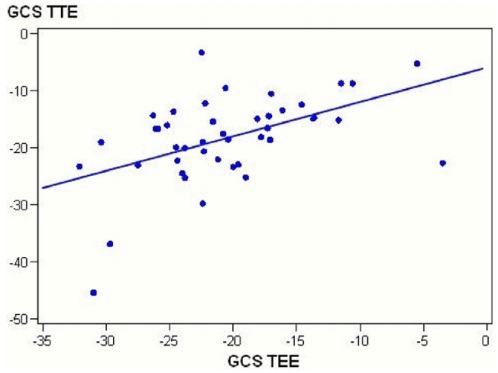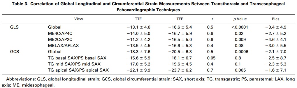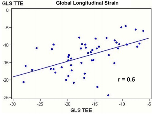 同じ患者にTTEとTEEを同時に行い、それぞれの左室のストレインの解析値を比較検討した前向き研究です。ちょっと古い報告ではありますが、この他に同じことをしているものは見つけられませんでした。