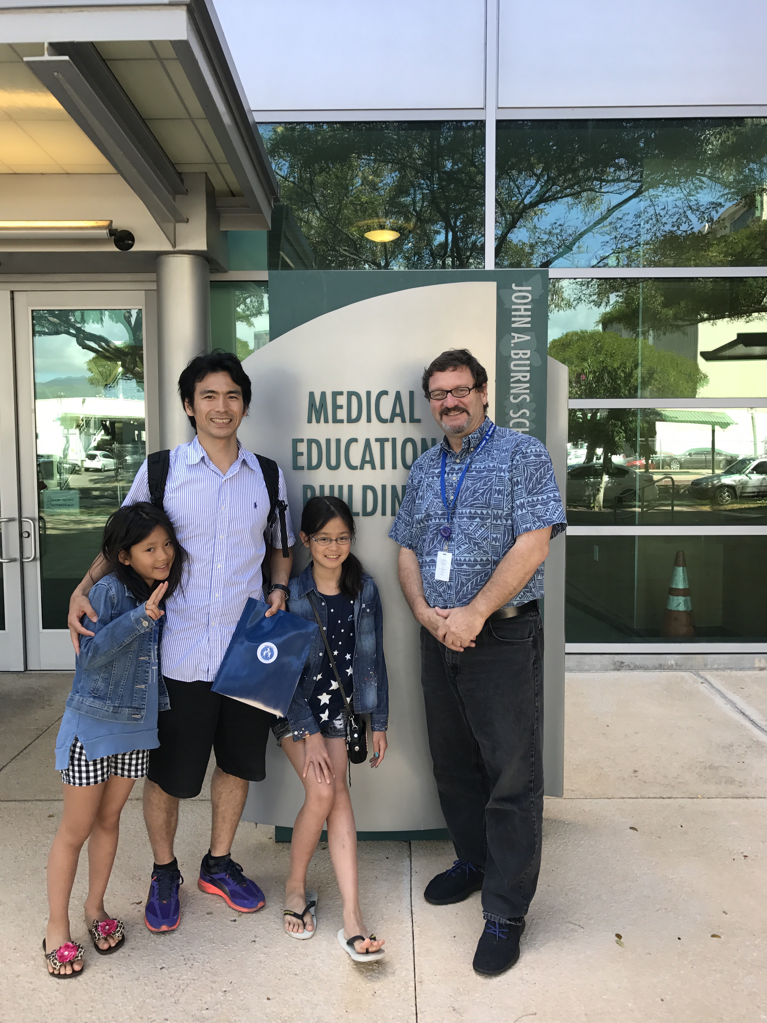日々の臨床と教育、家に帰ってからの子育て、どれも手を抜けない状況で、留学先を探さなければなりませんでした。実際は、本当に留学先がみつかるのか?という不安と焦燥にかられていました。ただし、先ほどのサッカー日本代表選手の言葉であったように、最終的には、どんな目的でもいいから、一度日本をでる、ということを実現すればいいと思ってたので、チャレンジ精神さえあれば、目的は達成できるように思います。 しかし、無給でハワイで1年以上生活するのは、多少貯金があったとしても並みの勤務医の給料では生活が苦しくなるのは明らかでした。亀田総合病院とSUNRISE研究会からサポートを受けることができ、なんとか留学できるようになりました。この場を借りて、感謝申し上げます。