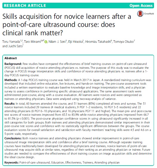 Toru Yamada, et al. “Skills acquisition for novice learners after a point-of-care ultrasound course: does clinical rank matter?.” BMC medical education 18.1 (2018): 202.
