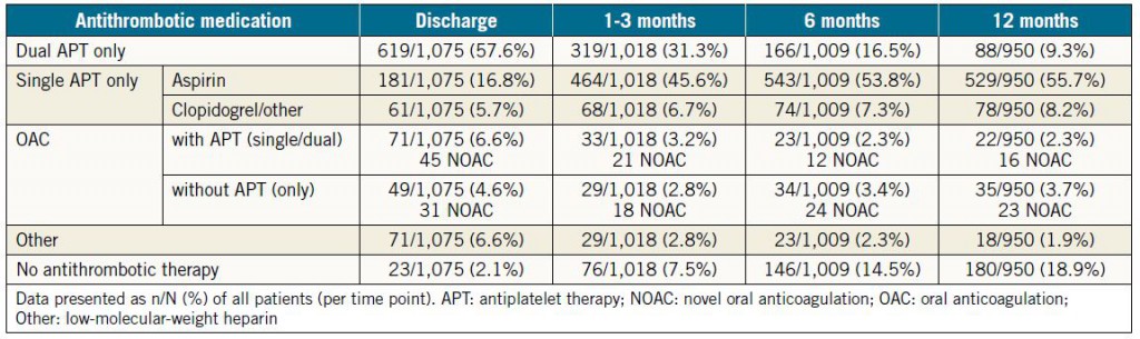12ヶ月後の時点では18.9%の患者が抗血小板薬、抗凝固薬いずれも内服していなかった。