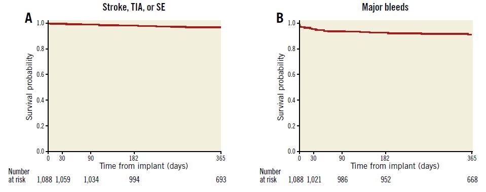 1年のfollow upで103件の出血性イベント(BARC≧3)が確認された(10.3%/year)。大部分のbleedingはfollow up早期に発生しており、29%が7日以内の手技関連のものであった。
