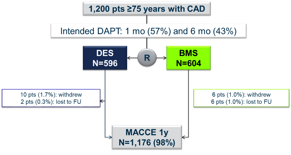75歳以上のCAD (StableとACS両方)患者。 臨床背景によってDESかBMSかをランダム化する前にあらかじめDAPT期間(Stable: 1ヶ月, ACS: 6ヶ月)を設定